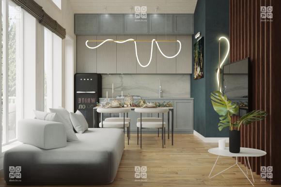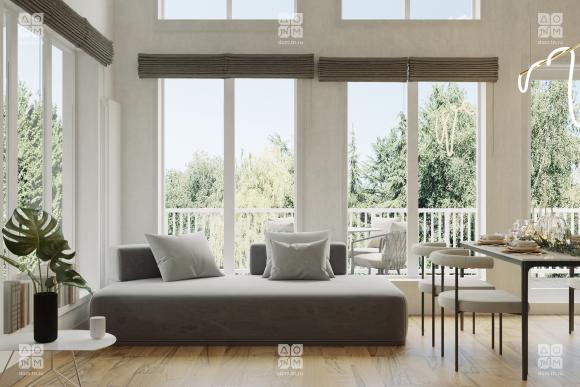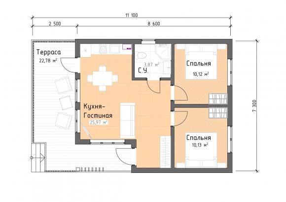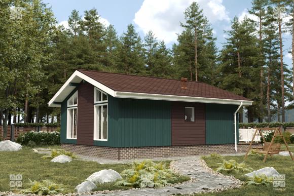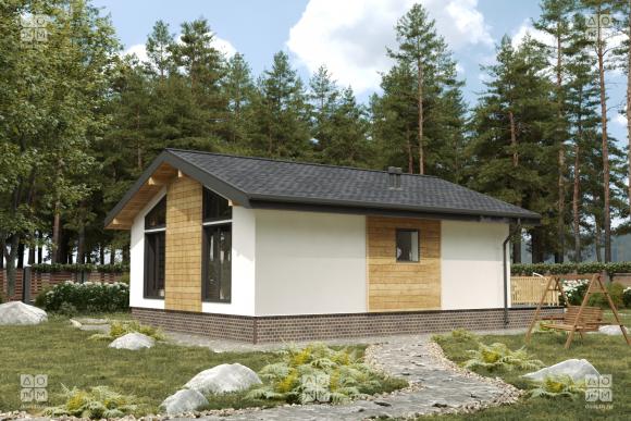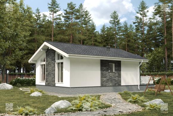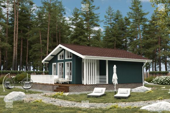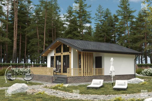 Компактный дом в стиле шале общей площадью 73 м² с двускатной крышей, вторым светом, двумя спальнями и открытой террасой. Стиль шале зародился в Альпах. Его отличают лаконичные формы, рациональная планировка, потолок по кровле и открытые конструктивные элементы. Такой теплый и надежный дом подходит для нашего климата и создает спокойную атмосферу загородного дома. Здесь хорошо и морозной зимой, и жарким летом. Сегодня шале — это воплощение комфорта и стиля. Большая площадь остекления пропускает солнечный свет вглубь дома. Терраса приглашает на семейные посиделки. А продуманная планировка делает дом удобным для всех домочадцев